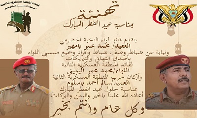رفع قائد لواء النخبة الحضرمي العقيد محمد عمر بامهير أسمى آيات التهاني وأصدق التبريكات إلى قيادة المنطقة العسكرية الثانية، ممثلةً باللواء محمد عمر اليميني قائد المنطقة، وأركان حرب المنطقة العميد سالم أحمد باسلوم،